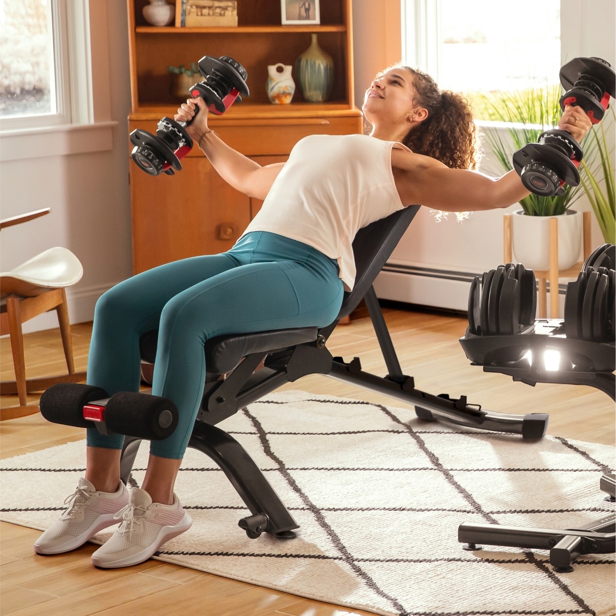 La construcción de acero de alta calidad y resistencia permite una capacidad de carga de 217,7 kg (usuario incluido). Ideal para combinar con tus mancuernas o barra de SelectTech; o para usar con un rack de entrenamiento de fuerza.